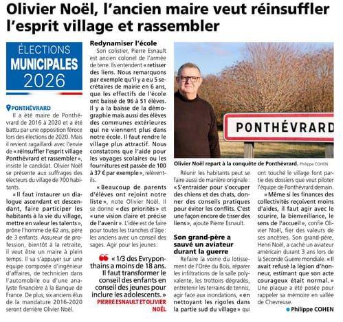 “Installé à Ponthévrard depuis 8 ans, libre de mon temps, je suis prêt à mettre mon expérience au profit de notre village, en oeuvrant quotidiennement avec enthousiasme, rigueur et désintéressement.”
